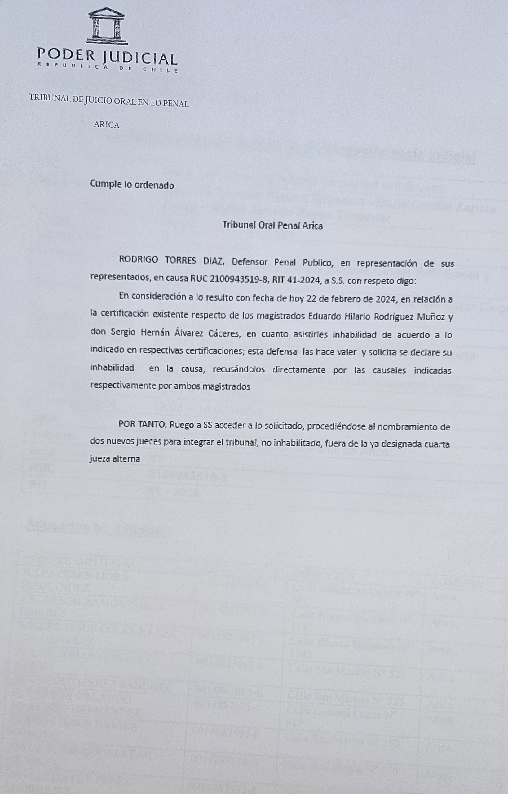 Con bastante diligencia y para “afirmar” ambas inhabilidades, la Defensoría Penal Pública, por medio del abogado Rodrigo Torres Díaz, validó las causales expresadas por los magistrados Álvarez y Rodríguez y presentó una solicitud al Tribunal Oral, indicando que “se declare su inhabilidad en la causa, recusándolos directamente por las causales indicadas respectivamente por ambos magistrados. Por tanto, ruego a S.S. acceder a lo solicitado, procediéndose al nombramiento de 2 nuevos jueces para integral el tribunal”.